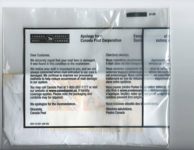 The sender of the letter did a good job of protecting the contents, I think. These are common stamps after all, and this damage is uncommon in my experience. But if I were sending expensive stamps through the mail, I’d be sure to add a waterproof layer inside the envelope too. If this were a mint Penny Black I’d be mighty upset at Canada Post right now.