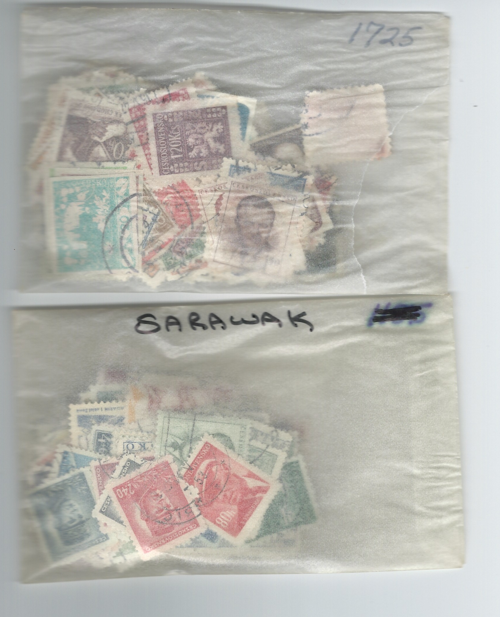 In this case, however, the letter must’ve been dropped in a puddle and left there for a long while. One of the glassines is just fine but the other got water inside too. So the stamps are stuck together in one brittle brick.